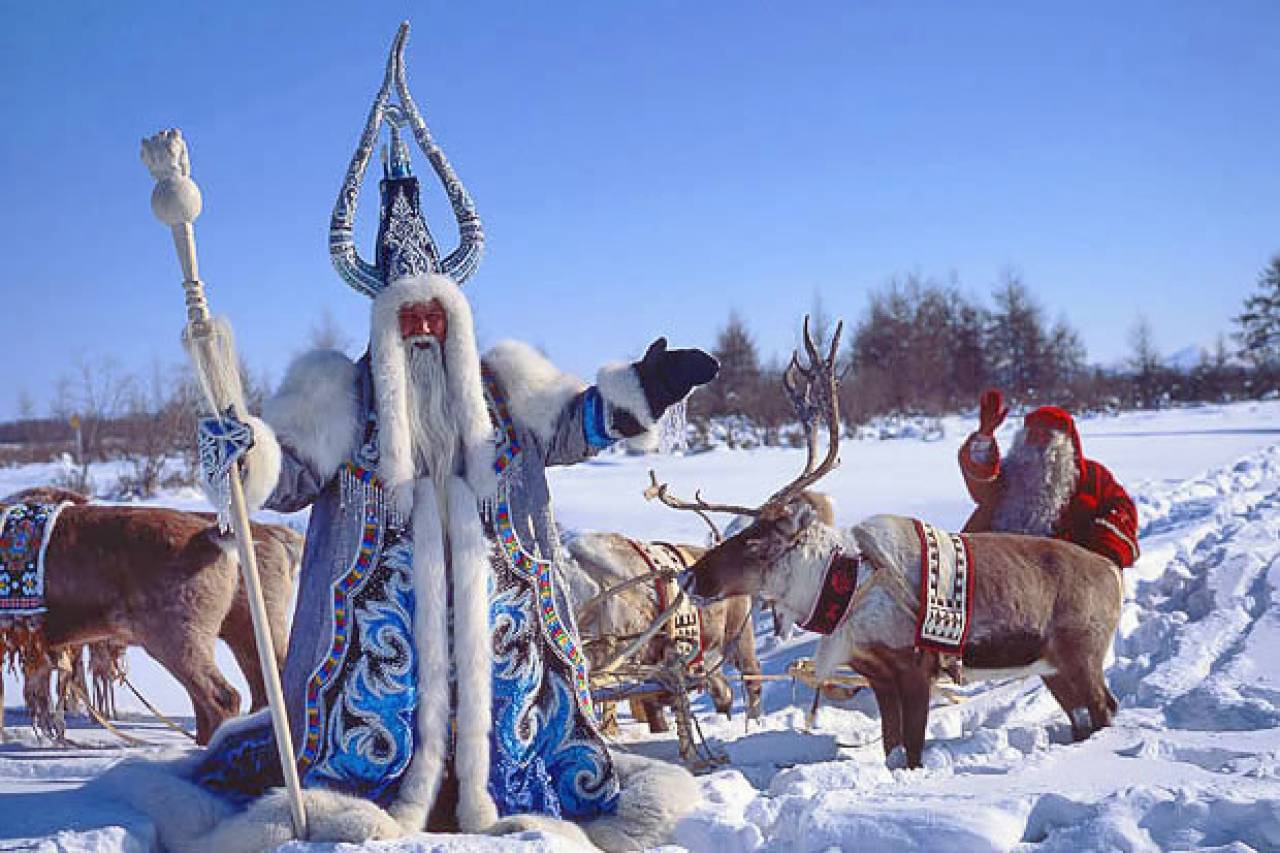 地元サハ共和国の伝統衣装を身に纏い、頭に雄牛の立派な角を生やしたなかなかいかついサンタクロースです。
